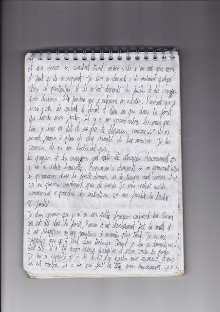 Après cet appel, j’ai voulu continuer un peu plus loin, j’ai donc continué la ligne droite que je suivais depuis le début (comme on le voit sur la première photo), mais je me suis arrêté net quand j’ai atteint l’endroit que l’on voit sur la deuxième photo. Le contraste n’est pas aussi marqué que ce que j’ai vu quand j’y étais, mais on voit bien qu’il y a une ombre très marquée, comme une frontière entre deux parties de la forêt. Ça m’a beaucoup intrigué, mais je commençais à me sentir vraiment mal, alors j’ai préféré rebrousser chemin. Je suis rentré chez Kélian et ai profité de son scanner pour copier la totalité du carnet sur une clé. Les policiers sont arrivés peu de temps après près de la maison, et j’ai décidé d’aller à leur rencontre. Comme je le pensais, ils ont voulu prendre le carnet avec eux. Ce qui m’a en revanche troublé, c’est que lorsque je leur ai parlé des accusations erronées qu’ils avaient portées contre Kélian, ils n’ont pas eu l’air de s’en souvenir et étaient persuadés qu’il s’agissait d’un malentendu. À partir de ce moment, j’ai préféré ne plus trop en dire. Je ne sais pas s’ils essayent de cacher une bavure ou s’ils se sont vraiment comportés comme cela sans le voir, mais ils n’étaient visiblement pas les personnes les plus dignes de confiance à qui m’adresser.