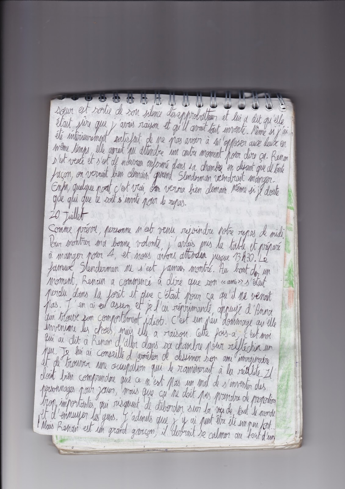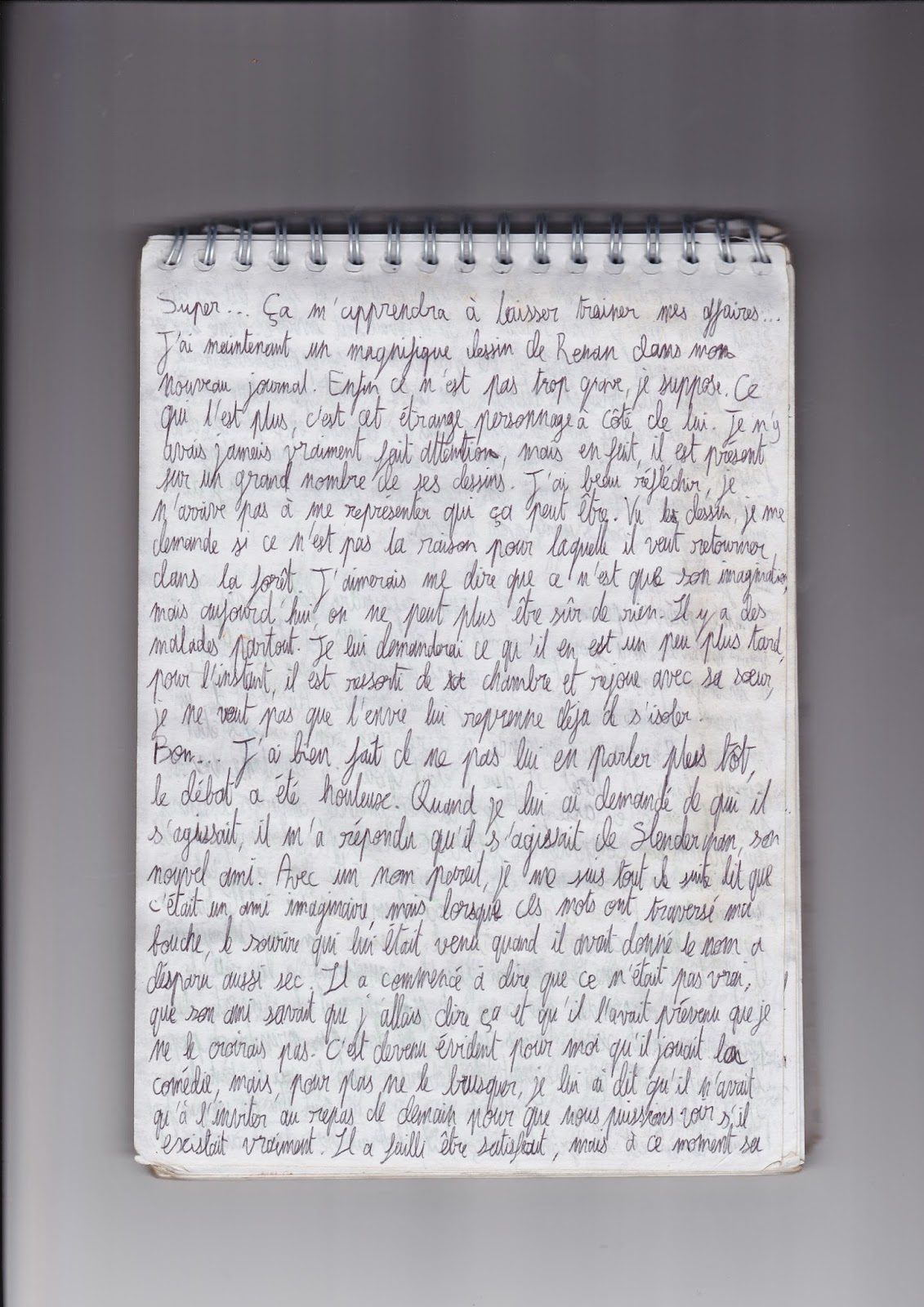 Ce n’était ni plus ni moins que le carnet d’où provenait la page arrachée que j’avais trouvée chez lui. Le fait qu’il y avait un peu de sang sur la dernière page m’a arrêté un moment. Je ne savais pas trop quoi faire, car j’avais à présent peur de trouver autre chose. J’ai fait une pause pour lire le contenu du carnet, et c’est là que j’ai compris tout ce qui s’était passé. Kélian avait eu son petit frère et sa petite sœur pour quelques jours et avait voulu les divertir de diverses manières, et après quelques jours, il s’est aperçu que Renan dessinait beaucoup Slenderman, bien qu’il ne savait pas ce que c’était et l’avait pris pour un ami imaginaire. Ils avaient eu quelques discussions à ce propos mais Renan avait fait la sourde oreille et avait fini par fuguer. Kélian l’a déclaré à la police, des recherches avaient été lancées mais, d’une manière ou d’une autre, ils ont cru que c’était lui le coupable, et qu’il l’avait probablement enlevé, voire pire. Sur le coup, j’ai eu une haine profonde pour la police, car ils ont dû répandre de sales rumeurs sur lui vu que les habitants du village ont rapidement commencé à se méfier ouvertement de lui. C’est inadmissible, Kélian n’est absolument pas le genre de personne capable de faire du mal à des enfants, encore moins à son propre frère !