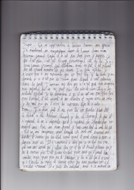 Quand je suis arrivé chez Kélian, j’ai pu constater que c’était vrai. La boîte aux lettres au bout du chemin menant à la maison était pleine à craquer. La porte d’entrée n’était même pas fermée. Curieusement, il n’y avait pas de trace de vandalisme. Par contre, je suis tombé sur un écureuil qui fouillait dans la cuisine. Il a très vite détalé quand il m’a vu. La poussière commençait à s’installer. Ça faisait bien deux semaines que plus personne n’avait bougé quoi que ce soit dans cette maison. En regardant dans le salon, j’ai trouvé quelques dessins, probablement faits par son petit frère ou sa petite sœur, et aussi une page visiblement arrachée d’un carnet. La page qui m’a fait tout découvrir. Voilà la photocopie d’un des côtés :